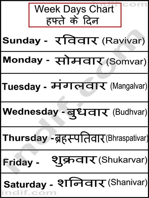 week name in hindi chart